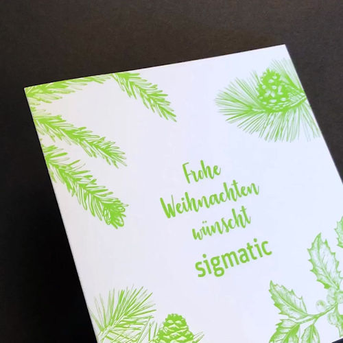 Weihnachtskarte mit Spezialfarbendruck und 3D-Spotlackierung, was den Text und die Elemente optisch und haptisch wirkungsvoll hervorhebt. Passendes transparentes Einlageblatt.