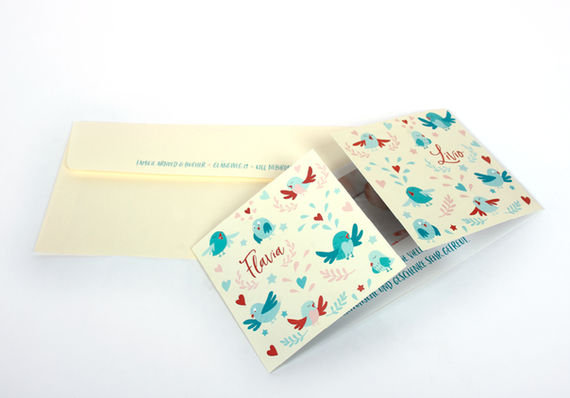 Online gestaltete Geburtskarte mit Fensterfalz , 2-seitig bedruckt auf Premium-Naturpapier, mit passend farblichen, personalisierten Couverts.