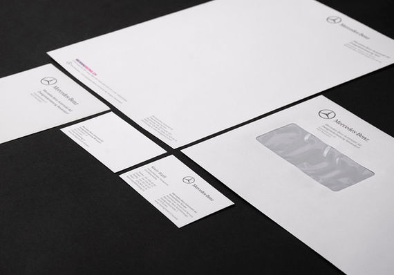 Briefpapier, Couvert, Visitenkarten und Aufkleber mit einheitlichem Markenauftritt für Mercedes-Benz Vertretung.