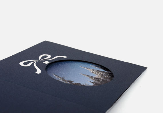 Weihnachtskarte aus Glimmerdreams-Karton navy mit Glimmereffekt und ausgestanzter Kugel-Form, welche den Blick auf das Einlageblatt freigibt. Schlaufe der Kugel als Silberfolienprägung mit Reliefeffekt.