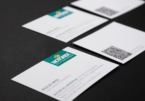 Visitenkarten mit natürlicher Oberfläche, beidseitig personalisiert bedruckt mit QR-Code auf Rückseite.
